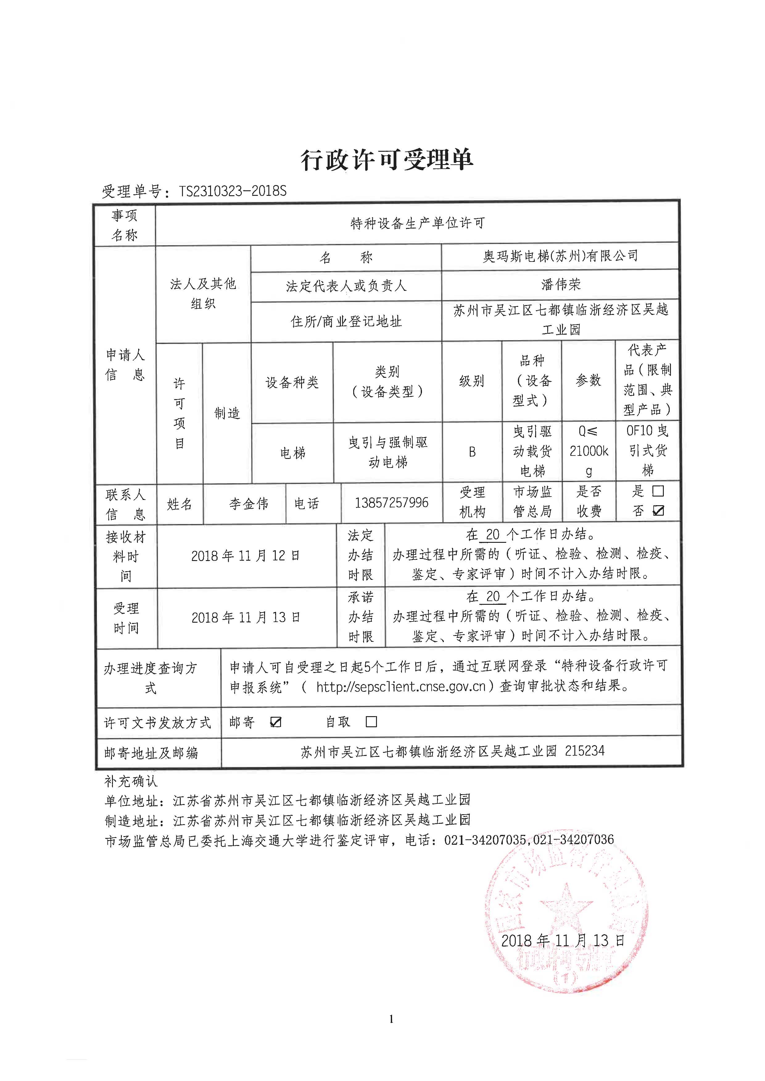在载货类电梯一系列的大研发投入、及性价比高的好产品的相继推向市场。完美官方网页版的“回头客户”也越来越多,产品美誉度也越来越高。但完美官方网页版人永不自满,不会因此固步自封。在激烈的市场竞争面前,完美官方网页版人时刻保持着一份清醒与危机意识。所以只要有机会,完美官方网页版人就不会轻意放弃。2018年完美官方网页版公司根据中国电梯市场大吨位货梯的需求动向,果断接受常州某客户的要约,试制一台超大吨位的21T 速度0.33M/S的 6:1结构的载货电梯产品。目前该产品的试制许可申请已顺利通过国家市场监督管理总局的批准。(附“行政许可受理单”)
